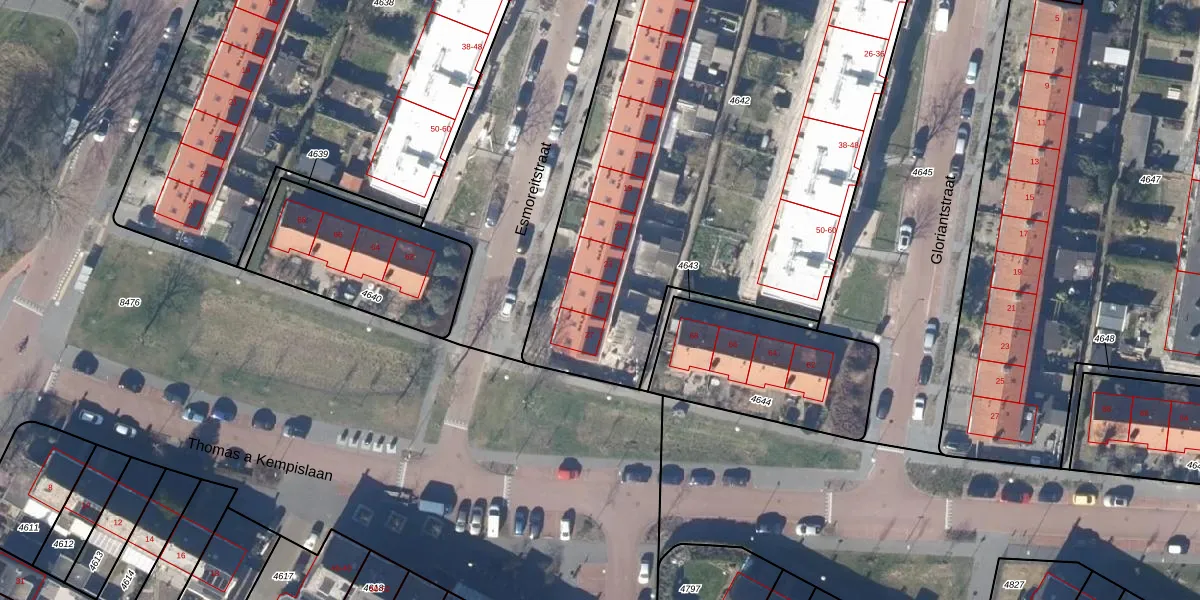 Het perceel waarop Esmoreitstraat 25 staat heeft een oppervlakte van 4157 m². Dit is een zeer groot perceel. De perceeloppervlakte wordt geregistreerd door het Kadaster. Gedetailleerde informatie over de maten van dit perceel kunt u vinden in het rapport Kadastrale kaart met maatvoering van Esmoreitstraat 25.
