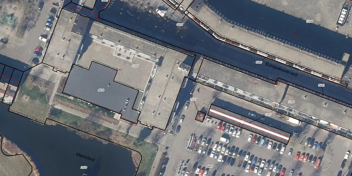 Het perceel waarop Europaboulevard 127 staat heeft een oppervlakte van 2594 m². Dit is een zeer groot perceel. De perceeloppervlakte wordt geregistreerd door het Kadaster. Gedetailleerde informatie over de maten van dit perceel kunt u vinden in het rapport Kadastrale kaart met maatvoering van Europaboulevard 127.