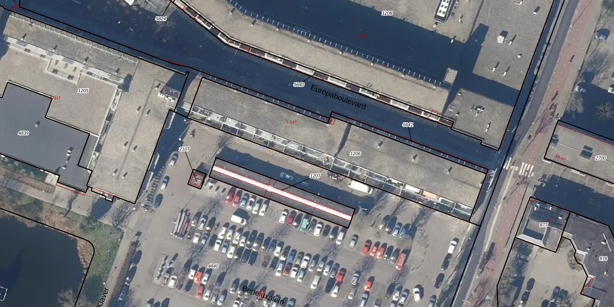 Het perceel waarop Europaboulevard 133 staat heeft een oppervlakte van 1518 m². Dit is een zeer groot perceel. De perceeloppervlakte wordt geregistreerd door het Kadaster. Gedetailleerde informatie over de maten van dit perceel kunt u vinden in het rapport Kadastrale kaart met maatvoering van Europaboulevard 133.