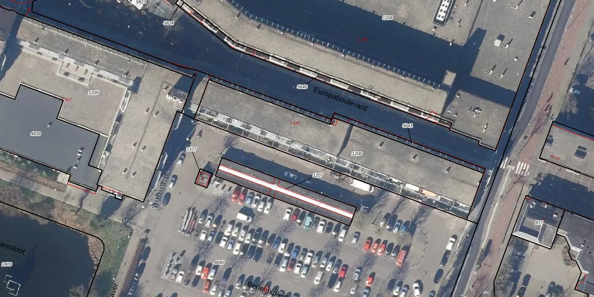 Het perceel waarop Europaboulevard 135 staat heeft een oppervlakte van 1518 m². Dit is een zeer groot perceel. De perceeloppervlakte wordt geregistreerd door het Kadaster. Gedetailleerde informatie over de maten van dit perceel kunt u vinden in het rapport Kadastrale kaart met maatvoering van Europaboulevard 135.