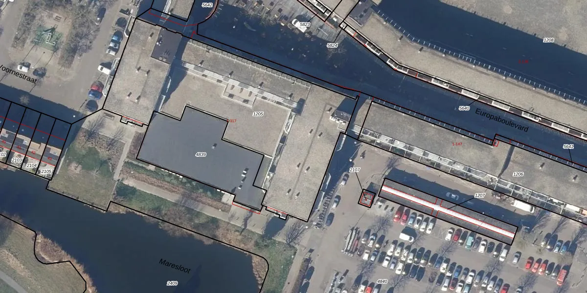 Het perceel waarop Europaboulevard 155 staat heeft een oppervlakte van 2594 m². Dit is een zeer groot perceel. De perceeloppervlakte wordt geregistreerd door het Kadaster. Gedetailleerde informatie over de maten van dit perceel kunt u vinden in het rapport Kadastrale kaart met maatvoering van Europaboulevard 155.