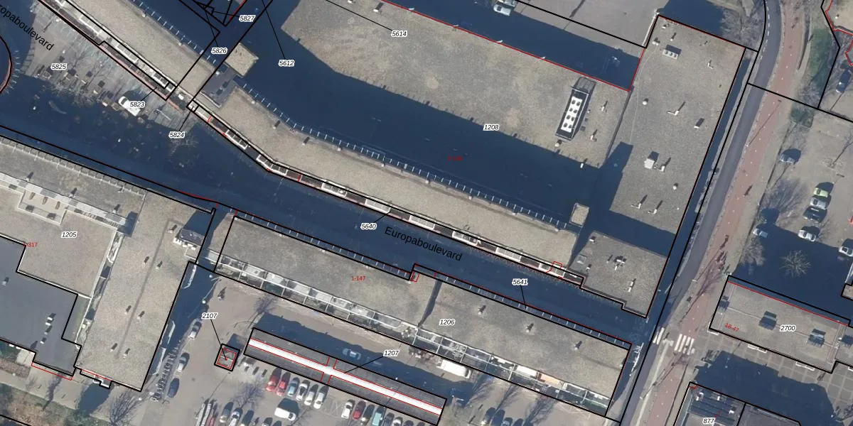 Het perceel waarop Europaboulevard 16 staat heeft een oppervlakte van 6417 m². Dit is een zeer groot perceel. De perceeloppervlakte wordt geregistreerd door het Kadaster. Gedetailleerde informatie over de maten van dit perceel kunt u vinden in het rapport Kadastrale kaart met maatvoering van Europaboulevard 16.