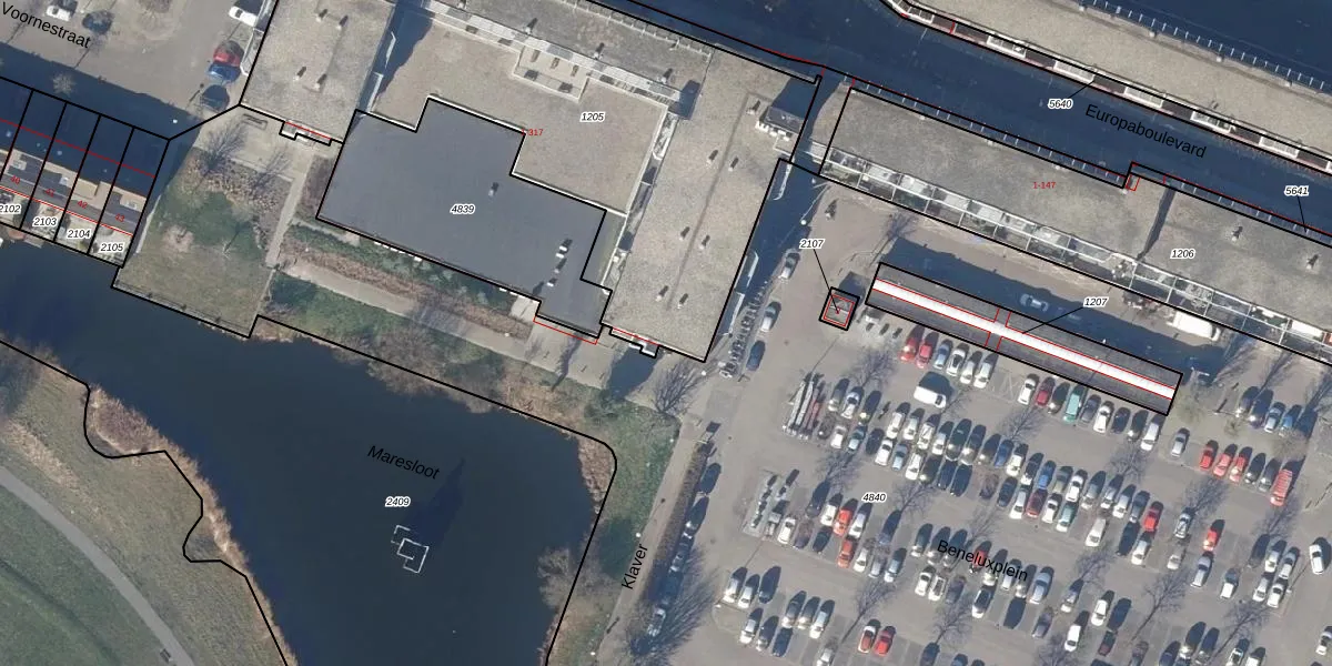 Het perceel waarop Europaboulevard 165 staat heeft een oppervlakte van 2594 m². Dit is een zeer groot perceel. De perceeloppervlakte wordt geregistreerd door het Kadaster. Gedetailleerde informatie over de maten van dit perceel kunt u vinden in het rapport Kadastrale kaart met maatvoering van Europaboulevard 165.
