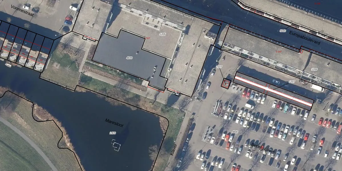 Het perceel waarop Europaboulevard 167 staat heeft een oppervlakte van 2594 m². Dit is een zeer groot perceel. De perceeloppervlakte wordt geregistreerd door het Kadaster. Gedetailleerde informatie over de maten van dit perceel kunt u vinden in het rapport Kadastrale kaart met maatvoering van Europaboulevard 167.
