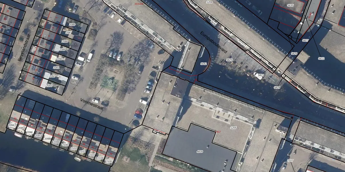 Het perceel waarop Europaboulevard 209 staat heeft een oppervlakte van 2594 m². Dit is een zeer groot perceel. De perceeloppervlakte wordt geregistreerd door het Kadaster. Gedetailleerde informatie over de maten van dit perceel kunt u vinden in het rapport Kadastrale kaart met maatvoering van Europaboulevard 209.