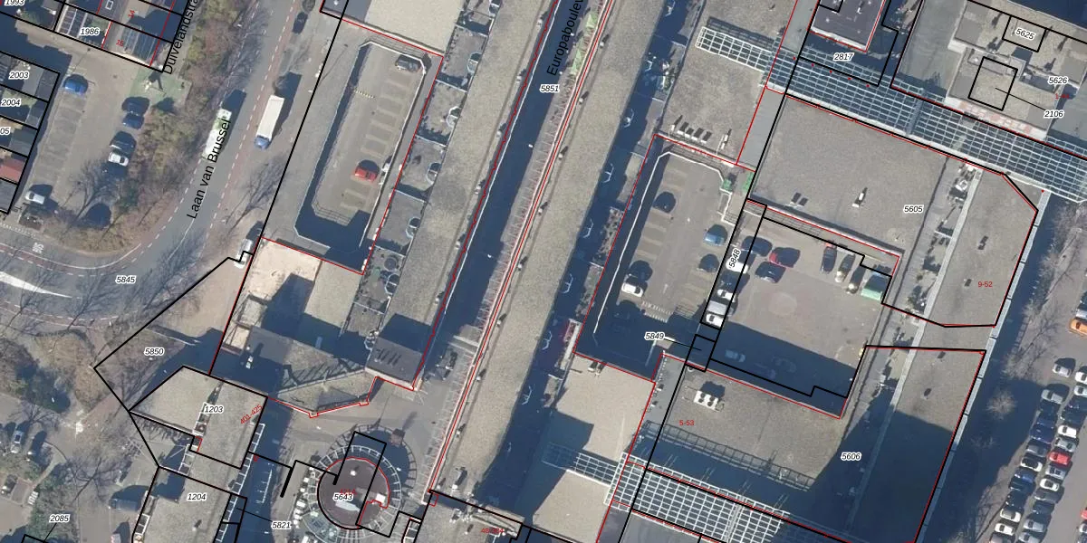 Het perceel waarop Europaboulevard 210 staat heeft een oppervlakte van 1,3 ha. Dit is een zeer groot perceel. De perceeloppervlakte wordt geregistreerd door het Kadaster. Gedetailleerde informatie over de maten van dit perceel kunt u vinden in het rapport Kadastrale kaart met maatvoering van Europaboulevard 210.
