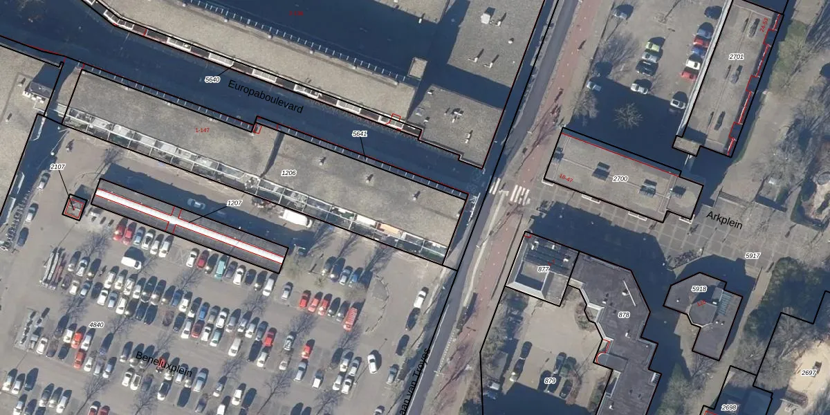 Het perceel waarop Europaboulevard 3 staat heeft een oppervlakte van 1518 m². Dit is een zeer groot perceel. De perceeloppervlakte wordt geregistreerd door het Kadaster. Gedetailleerde informatie over de maten van dit perceel kunt u vinden in het rapport Kadastrale kaart met maatvoering van Europaboulevard 3.