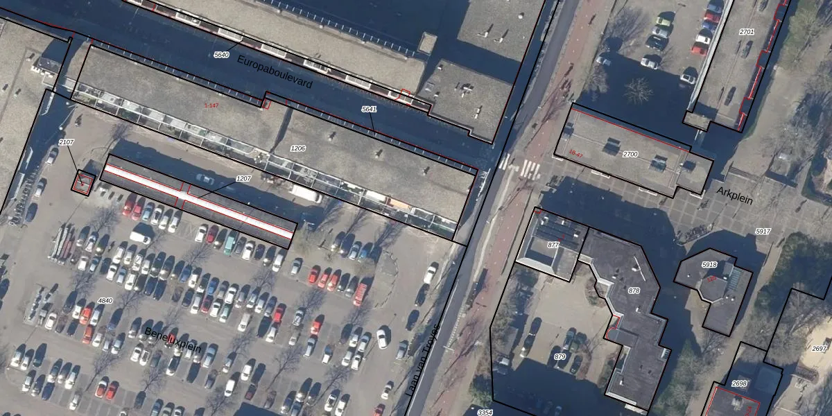 Het perceel waarop Europaboulevard 35 staat heeft een oppervlakte van 1518 m². Dit is een zeer groot perceel. De perceeloppervlakte wordt geregistreerd door het Kadaster. Gedetailleerde informatie over de maten van dit perceel kunt u vinden in het rapport Kadastrale kaart met maatvoering van Europaboulevard 35.