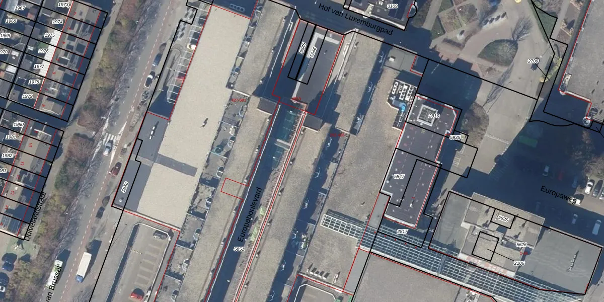 Het perceel waarop Europaboulevard 352 staat heeft een oppervlakte van 1,3 ha. Dit is een zeer groot perceel. De perceeloppervlakte wordt geregistreerd door het Kadaster. Gedetailleerde informatie over de maten van dit perceel kunt u vinden in het rapport Kadastrale kaart met maatvoering van Europaboulevard 352.