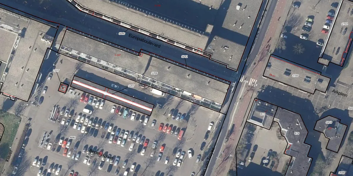 Het perceel waarop Europaboulevard 41 staat heeft een oppervlakte van 1518 m². Dit is een zeer groot perceel. De perceeloppervlakte wordt geregistreerd door het Kadaster. Gedetailleerde informatie over de maten van dit perceel kunt u vinden in het rapport Kadastrale kaart met maatvoering van Europaboulevard 41.