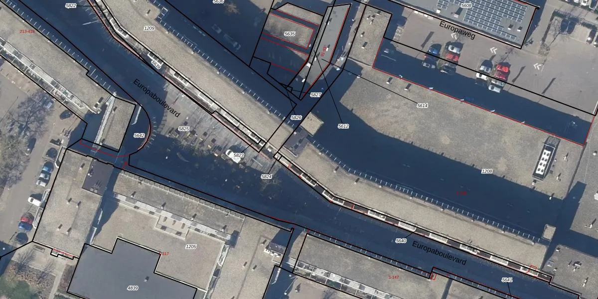 Het perceel waarop Europaboulevard 46 staat heeft een oppervlakte van 6417 m². Dit is een zeer groot perceel. De perceeloppervlakte wordt geregistreerd door het Kadaster. Gedetailleerde informatie over de maten van dit perceel kunt u vinden in het rapport Kadastrale kaart met maatvoering van Europaboulevard 46.