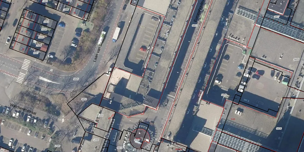 Het perceel waarop Europaboulevard 477 staat heeft een oppervlakte van 1,3 ha. Dit is een zeer groot perceel. De perceeloppervlakte wordt geregistreerd door het Kadaster. Gedetailleerde informatie over de maten van dit perceel kunt u vinden in het rapport Kadastrale kaart met maatvoering van Europaboulevard 477.