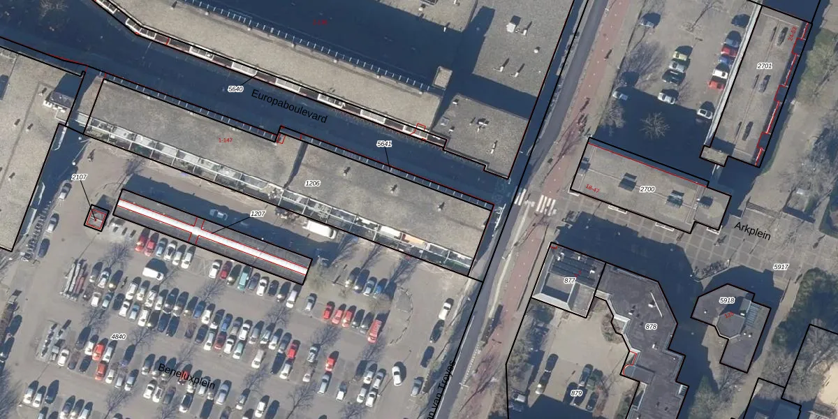 Het perceel waarop Europaboulevard 5 staat heeft een oppervlakte van 1518 m². Dit is een zeer groot perceel. De perceeloppervlakte wordt geregistreerd door het Kadaster. Gedetailleerde informatie over de maten van dit perceel kunt u vinden in het rapport Kadastrale kaart met maatvoering van Europaboulevard 5.
