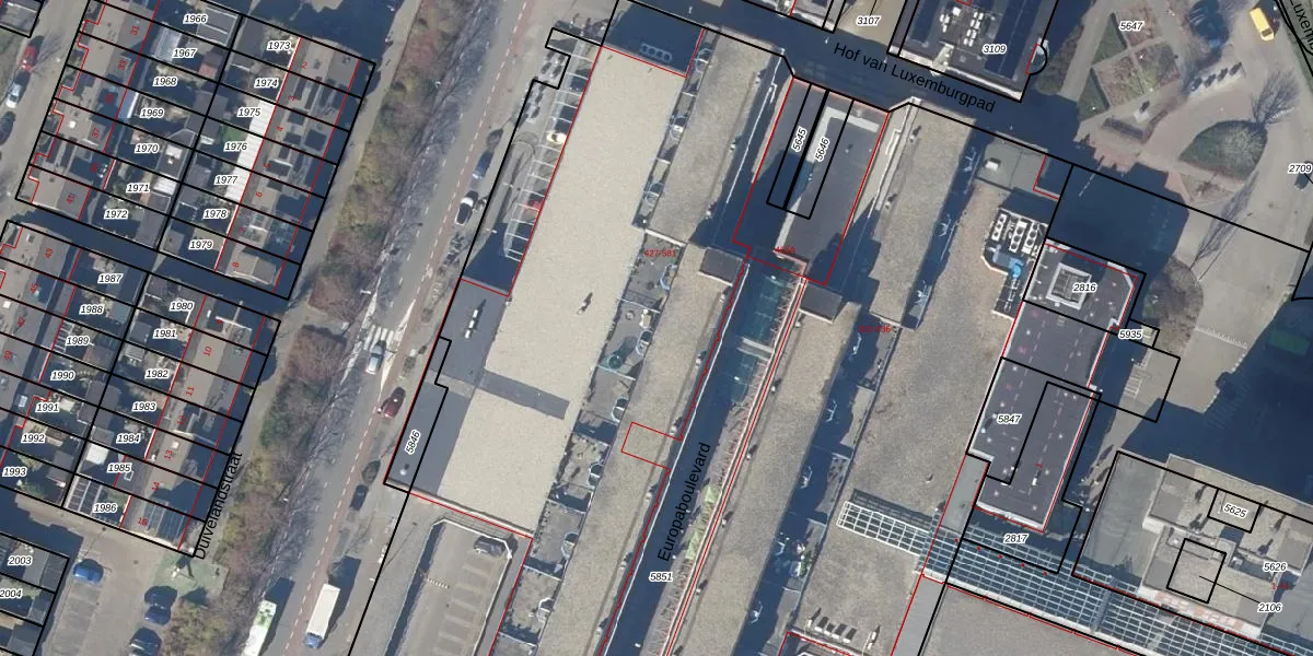 Het perceel waarop Europaboulevard 543 staat heeft een oppervlakte van 1,3 ha. Dit is een zeer groot perceel. De perceeloppervlakte wordt geregistreerd door het Kadaster. Gedetailleerde informatie over de maten van dit perceel kunt u vinden in het rapport Kadastrale kaart met maatvoering van Europaboulevard 543.