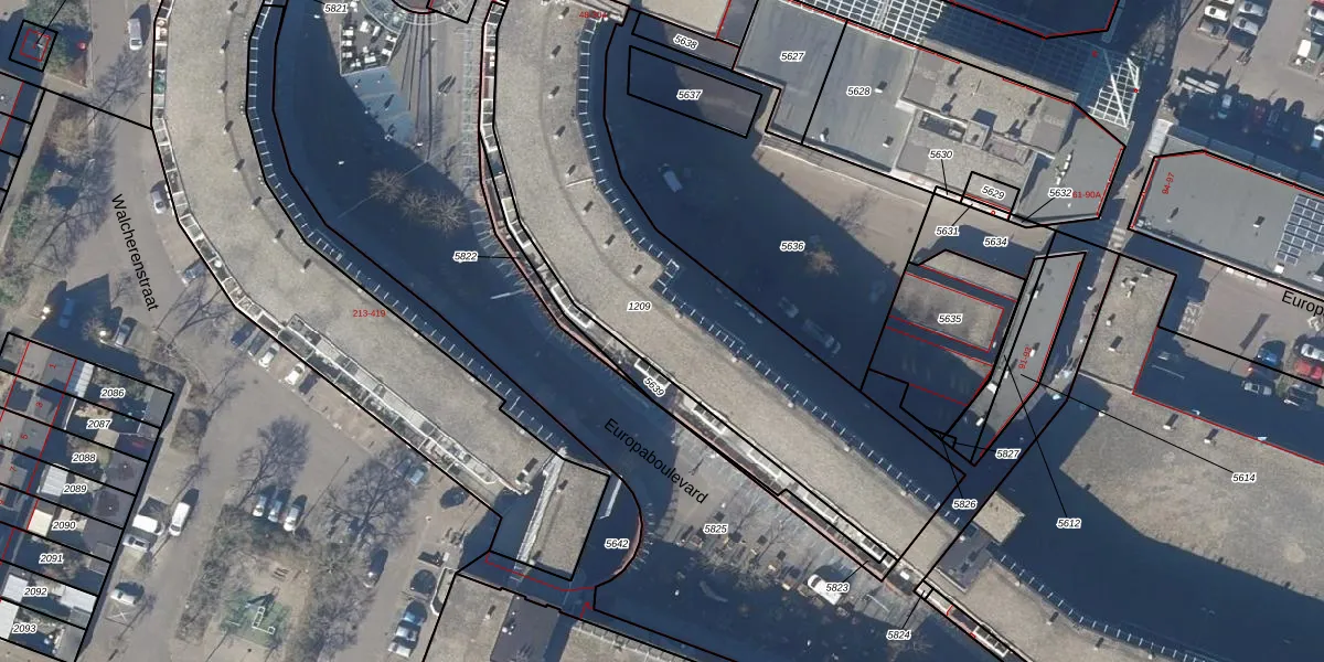 Het perceel waarop Europaboulevard 60 staat heeft een oppervlakte van 1770 m². Dit is een zeer groot perceel. De perceeloppervlakte wordt geregistreerd door het Kadaster. Gedetailleerde informatie over de maten van dit perceel kunt u vinden in het rapport Kadastrale kaart met maatvoering van Europaboulevard 60.