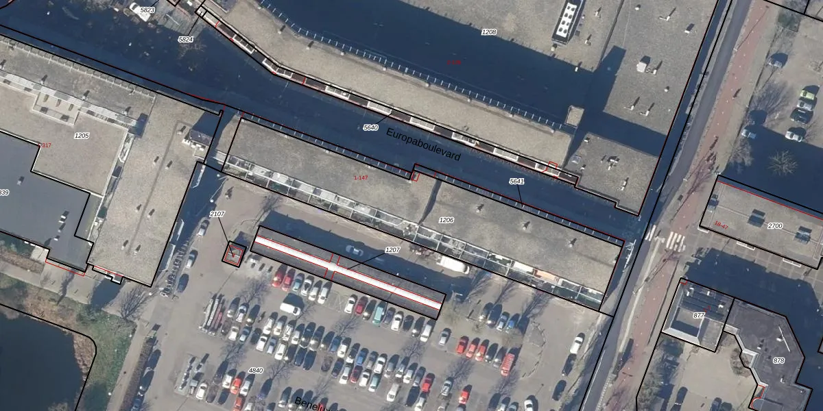 Het perceel waarop Europaboulevard 67 staat heeft een oppervlakte van 1518 m². Dit is een zeer groot perceel. De perceeloppervlakte wordt geregistreerd door het Kadaster. Gedetailleerde informatie over de maten van dit perceel kunt u vinden in het rapport Kadastrale kaart met maatvoering van Europaboulevard 67.