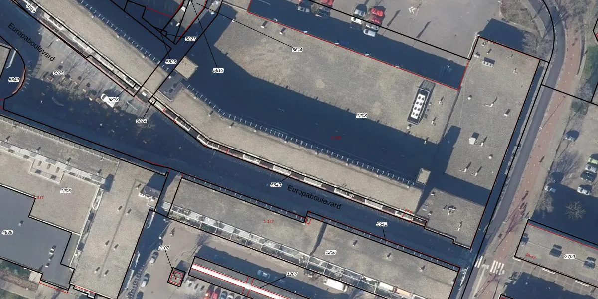 Het perceel waarop Europaboulevard 68 staat heeft een oppervlakte van 6417 m². Dit is een zeer groot perceel. De perceeloppervlakte wordt geregistreerd door het Kadaster. Gedetailleerde informatie over de maten van dit perceel kunt u vinden in het rapport Kadastrale kaart met maatvoering van Europaboulevard 68.