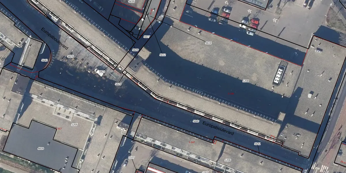 Het perceel waarop Europaboulevard 72 staat heeft een oppervlakte van 6417 m². Dit is een zeer groot perceel. De perceeloppervlakte wordt geregistreerd door het Kadaster. Gedetailleerde informatie over de maten van dit perceel kunt u vinden in het rapport Kadastrale kaart met maatvoering van Europaboulevard 72.