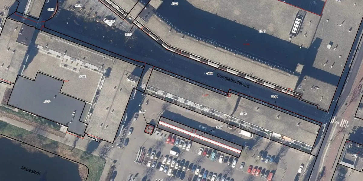 Het perceel waarop Europaboulevard 77 staat heeft een oppervlakte van 1518 m². Dit is een zeer groot perceel. De perceeloppervlakte wordt geregistreerd door het Kadaster. Gedetailleerde informatie over de maten van dit perceel kunt u vinden in het rapport Kadastrale kaart met maatvoering van Europaboulevard 77.