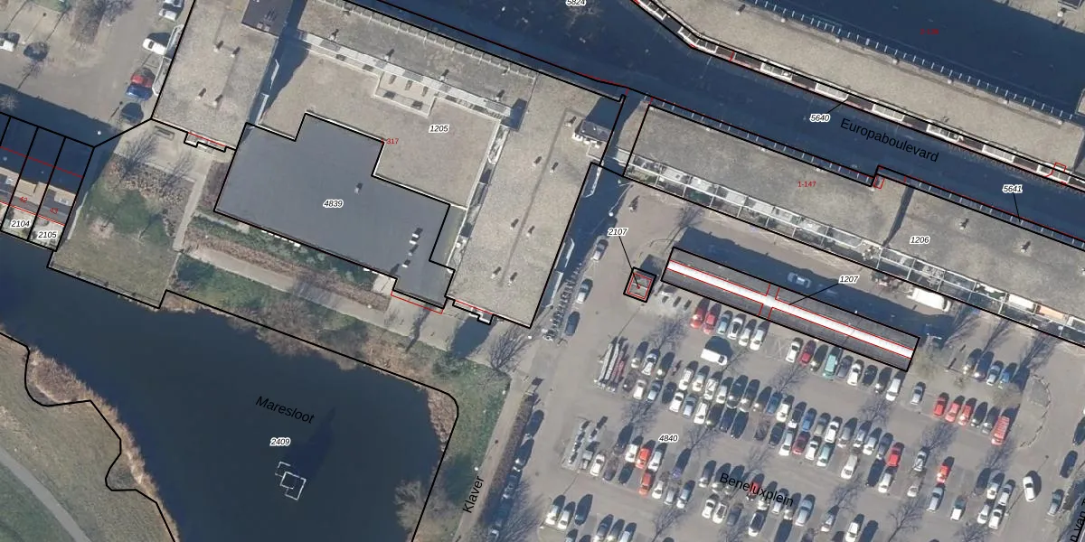 Het perceel waarop Europaboulevard 85 staat heeft een oppervlakte van 2594 m². Dit is een zeer groot perceel. De perceeloppervlakte wordt geregistreerd door het Kadaster. Gedetailleerde informatie over de maten van dit perceel kunt u vinden in het rapport Kadastrale kaart met maatvoering van Europaboulevard 85.