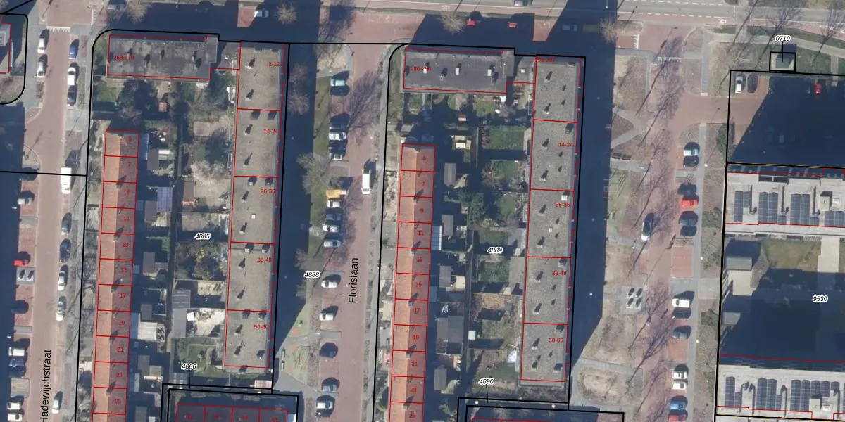 Het perceel waarop Florislaan 9 staat heeft een oppervlakte van 4190 m². Dit is een zeer groot perceel. De perceeloppervlakte wordt geregistreerd door het Kadaster. Gedetailleerde informatie over de maten van dit perceel kunt u vinden in het rapport Kadastrale kaart met maatvoering van Florislaan 9.
