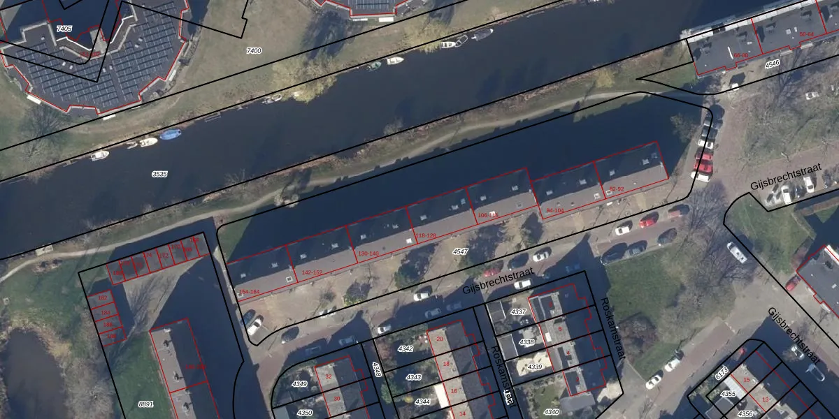 Het perceel waarop Gijsbrechtstraat 126 staat heeft een oppervlakte van 3250 m². Dit is een zeer groot perceel. De perceeloppervlakte wordt geregistreerd door het Kadaster. Gedetailleerde informatie over de maten van dit perceel kunt u vinden in het rapport Kadastrale kaart met maatvoering van Gijsbrechtstraat 126.