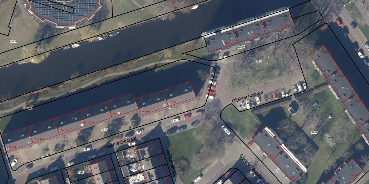 Het perceel waarop Gijsbrechtstraat 88 staat heeft een oppervlakte van 3250 m². Dit is een zeer groot perceel. De perceeloppervlakte wordt geregistreerd door het Kadaster. Gedetailleerde informatie over de maten van dit perceel kunt u vinden in het rapport Kadastrale kaart met maatvoering van Gijsbrechtstraat 88.