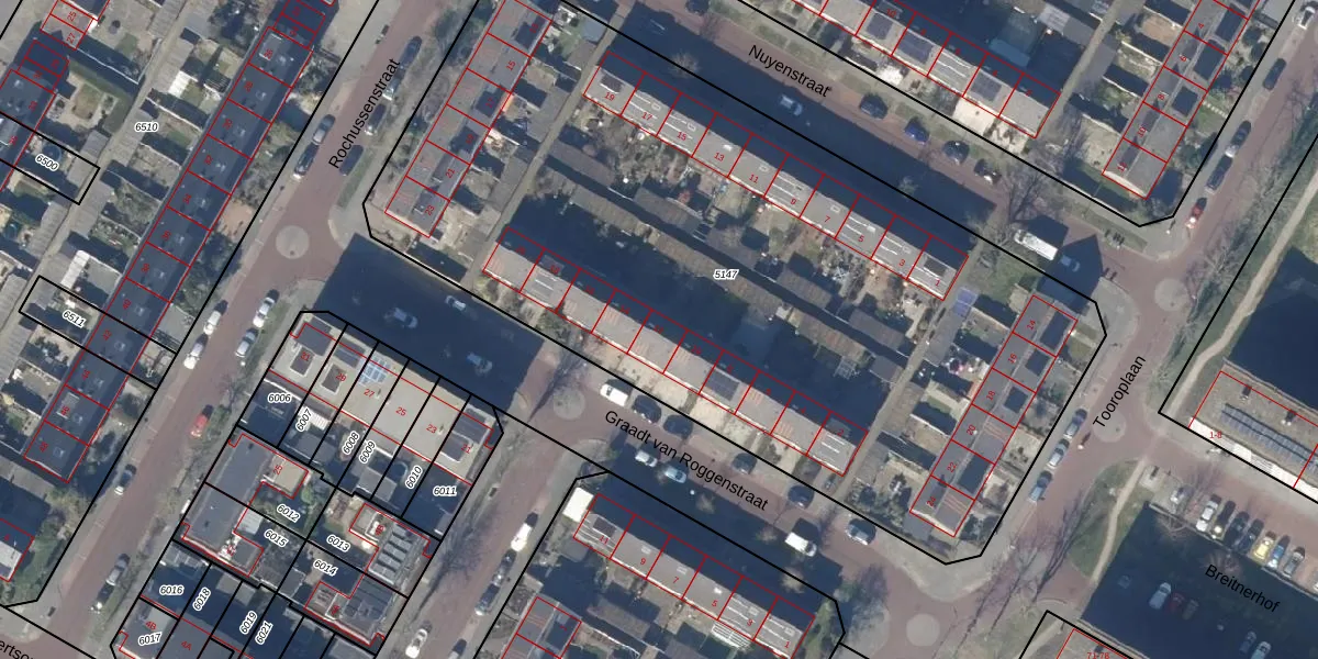 Het perceel waarop Graadt van Roggenstraat 12 staat heeft een oppervlakte van 4947 m². Dit is een zeer groot perceel. De perceeloppervlakte wordt geregistreerd door het Kadaster. Gedetailleerde informatie over de maten van dit perceel kunt u vinden in het rapport Kadastrale kaart met maatvoering van Graadt van Roggenstraat 12.