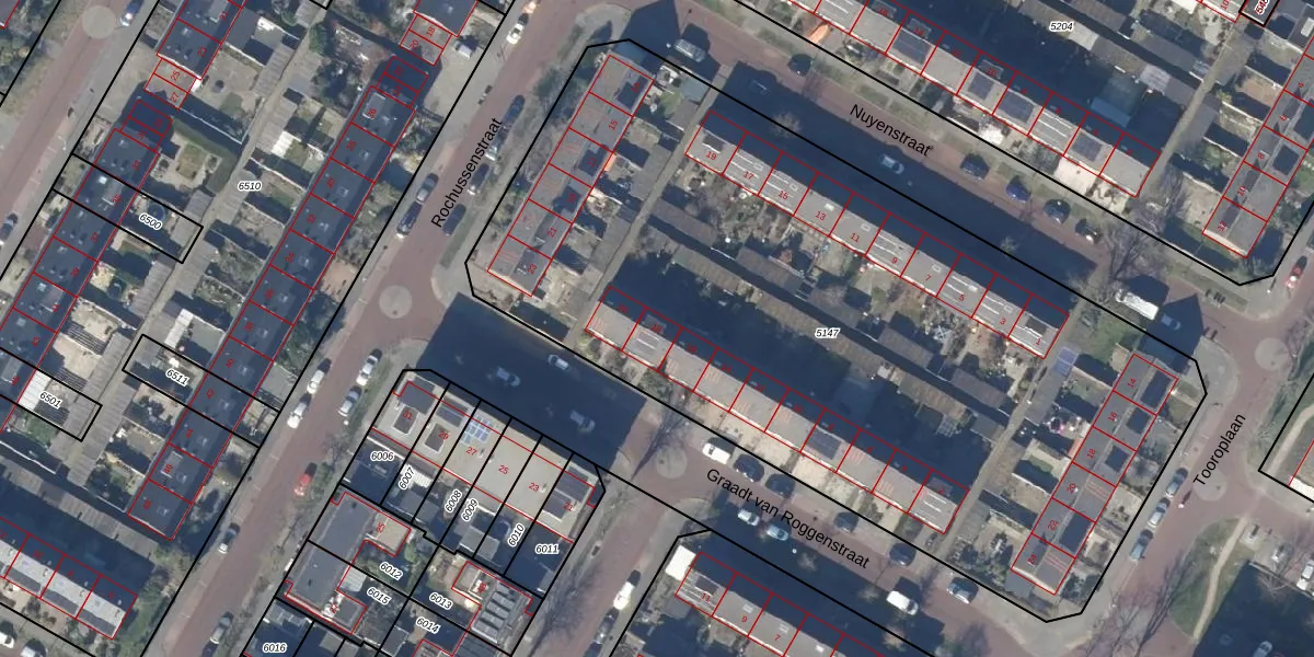 Het perceel waarop Graadt van Roggenstraat 18 staat heeft een oppervlakte van 4947 m². Dit is een zeer groot perceel. De perceeloppervlakte wordt geregistreerd door het Kadaster. Gedetailleerde informatie over de maten van dit perceel kunt u vinden in het rapport Kadastrale kaart met maatvoering van Graadt van Roggenstraat 18.