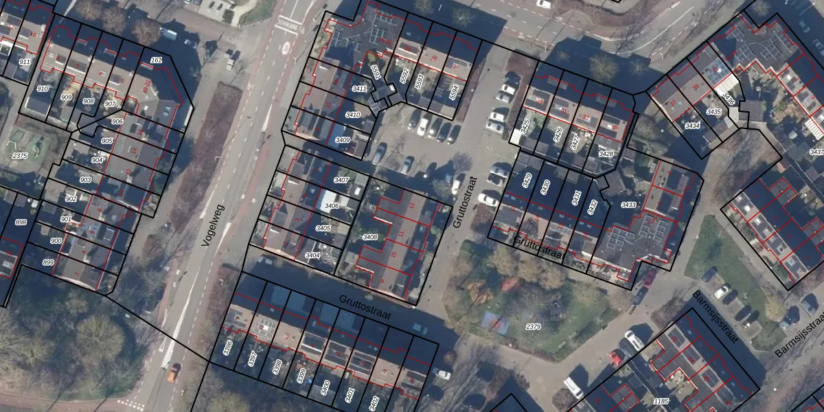Het perceel waarop Gruttostraat 12 staat heeft een oppervlakte van 547 m². Dit is een groot perceel. De perceeloppervlakte wordt geregistreerd door het Kadaster. Gedetailleerde informatie over de maten van dit perceel kunt u vinden in het rapport Kadastrale kaart met maatvoering van Gruttostraat 12.
