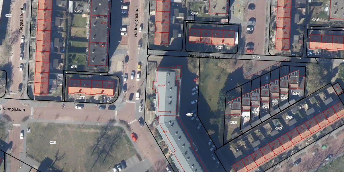 Het perceel waarop Hadewijchstraat 109 staat heeft een oppervlakte van 2562 m². Dit is een zeer groot perceel. De perceeloppervlakte wordt geregistreerd door het Kadaster. Gedetailleerde informatie over de maten van dit perceel kunt u vinden in het rapport Kadastrale kaart met maatvoering van Hadewijchstraat 109.