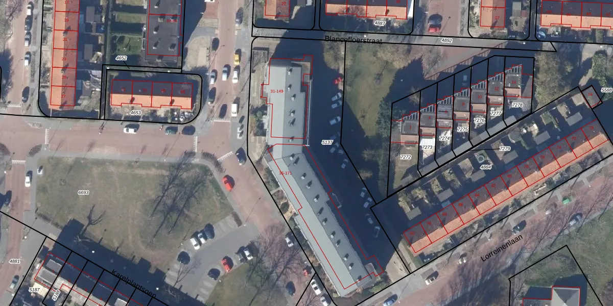 Het perceel waarop Hadewijchstraat 151 staat heeft een oppervlakte van 2562 m². Dit is een zeer groot perceel. De perceeloppervlakte wordt geregistreerd door het Kadaster. Gedetailleerde informatie over de maten van dit perceel kunt u vinden in het rapport Kadastrale kaart met maatvoering van Hadewijchstraat 151.