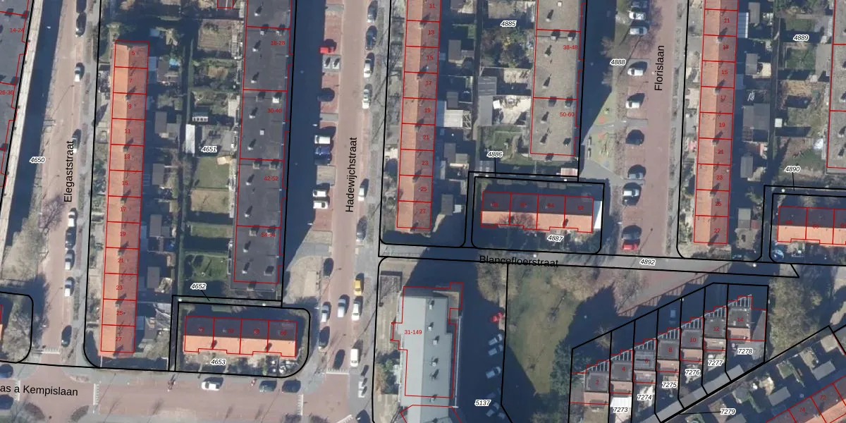 Het perceel waarop Hadewijchstraat 27 staat heeft een oppervlakte van 4190 m². Dit is een zeer groot perceel. De perceeloppervlakte wordt geregistreerd door het Kadaster. Gedetailleerde informatie over de maten van dit perceel kunt u vinden in het rapport Kadastrale kaart met maatvoering van Hadewijchstraat 27.