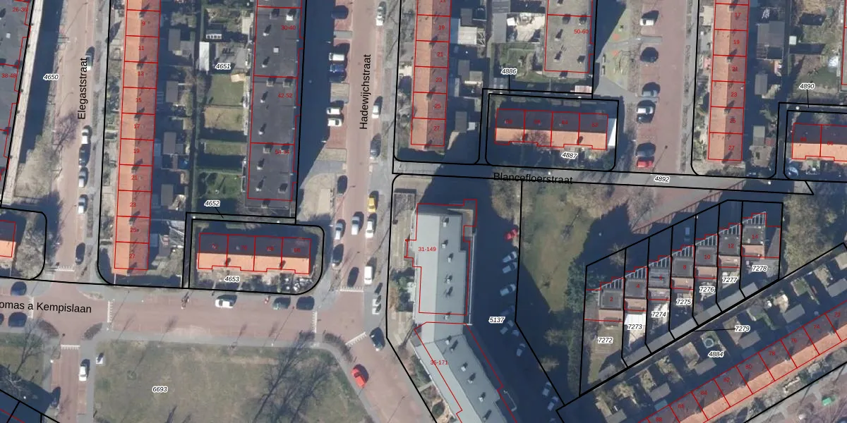 Het perceel waarop Hadewijchstraat 31-A staat heeft een oppervlakte van 2562 m². Dit is een zeer groot perceel. De perceeloppervlakte wordt geregistreerd door het Kadaster. Gedetailleerde informatie over de maten van dit perceel kunt u vinden in het rapport Kadastrale kaart met maatvoering van Hadewijchstraat 31-A.