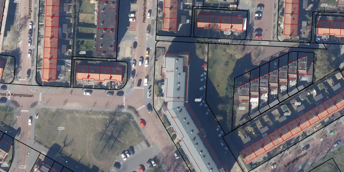 Het perceel waarop Hadewijchstraat 45 staat heeft een oppervlakte van 2562 m². Dit is een zeer groot perceel. De perceeloppervlakte wordt geregistreerd door het Kadaster. Gedetailleerde informatie over de maten van dit perceel kunt u vinden in het rapport Kadastrale kaart met maatvoering van Hadewijchstraat 45.