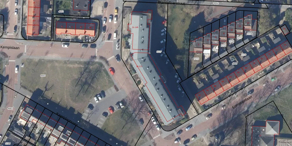Het perceel waarop Hadewijchstraat 53 staat heeft een oppervlakte van 2562 m². Dit is een zeer groot perceel. De perceeloppervlakte wordt geregistreerd door het Kadaster. Gedetailleerde informatie over de maten van dit perceel kunt u vinden in het rapport Kadastrale kaart met maatvoering van Hadewijchstraat 53.