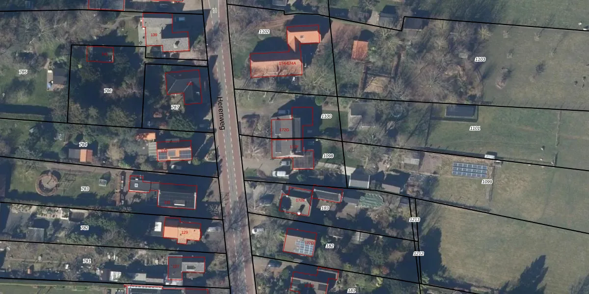 Het perceel waarop Herenweg 172-F staat heeft een oppervlakte van 540 m². Dit is een groot perceel. De perceeloppervlakte wordt geregistreerd door het Kadaster. Gedetailleerde informatie over de maten van dit perceel kunt u vinden in het rapport Kadastrale kaart met maatvoering van Herenweg 172-F.