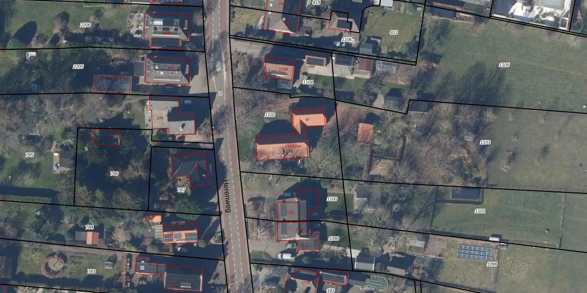 Het perceel waarop Herenweg 174 staat heeft een oppervlakte van 960 m². Dit is een groot perceel. De perceeloppervlakte wordt geregistreerd door het Kadaster. Gedetailleerde informatie over de maten van dit perceel kunt u vinden in het rapport Kadastrale kaart met maatvoering van Herenweg 174.
