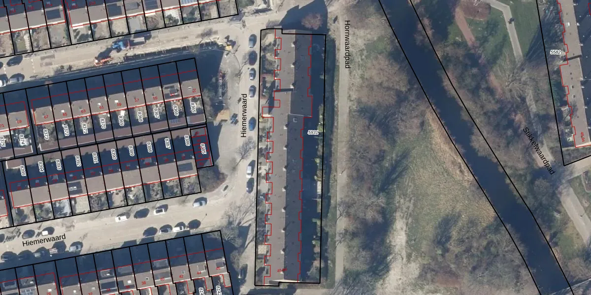 Het perceel waarop Hiemerwaard 84 staat heeft een oppervlakte van 1873 m². Dit is een zeer groot perceel. De perceeloppervlakte wordt geregistreerd door het Kadaster. Gedetailleerde informatie over de maten van dit perceel kunt u vinden in het rapport Kadastrale kaart met maatvoering van Hiemerwaard 84.