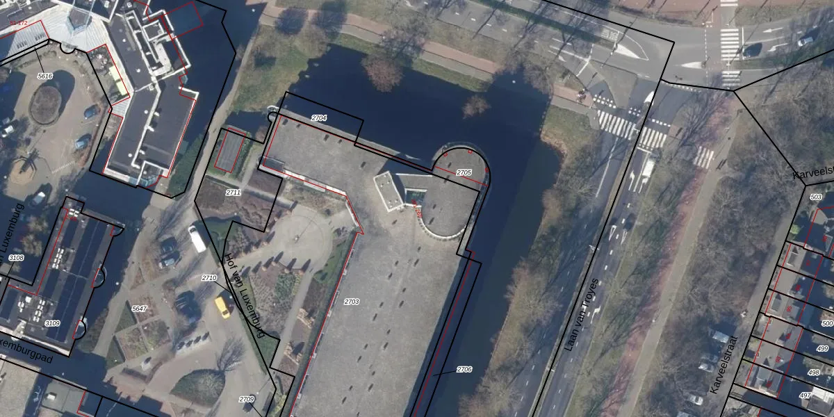 Het perceel waarop Hof van Luxemburg 265 staat heeft een oppervlakte van 3368 m². Dit is een zeer groot perceel. De perceeloppervlakte wordt geregistreerd door het Kadaster. Gedetailleerde informatie over de maten van dit perceel kunt u vinden in het rapport Kadastrale kaart met maatvoering van Hof van Luxemburg 265.