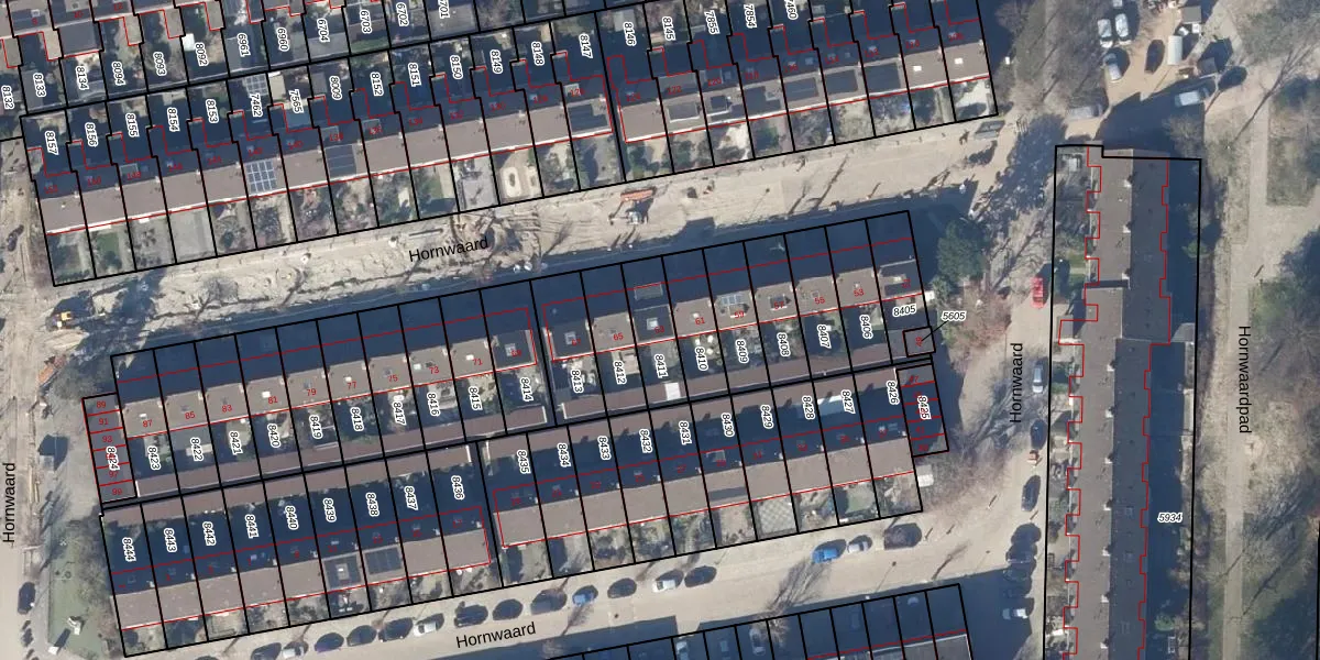 Het perceel waarop Hornwaard 63 staat heeft een oppervlakte van 142 m². Dit is een middelgroot perceel. De perceeloppervlakte wordt geregistreerd door het Kadaster. Gedetailleerde informatie over de maten van dit perceel kunt u vinden in het rapport Kadastrale kaart met maatvoering van Hornwaard 63.