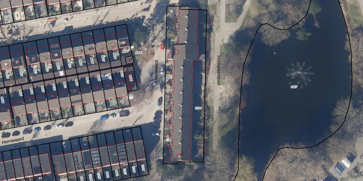 Het perceel waarop Hornwaard 70 staat heeft een oppervlakte van 1873 m². Dit is een zeer groot perceel. De perceeloppervlakte wordt geregistreerd door het Kadaster. Gedetailleerde informatie over de maten van dit perceel kunt u vinden in het rapport Kadastrale kaart met maatvoering van Hornwaard 70.