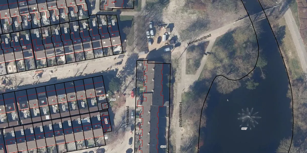 Het perceel waarop Hornwaard 80 staat heeft een oppervlakte van 1873 m². Dit is een zeer groot perceel. De perceeloppervlakte wordt geregistreerd door het Kadaster. Gedetailleerde informatie over de maten van dit perceel kunt u vinden in het rapport Kadastrale kaart met maatvoering van Hornwaard 80.