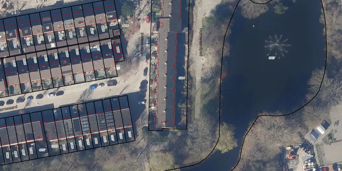 Het perceel waarop Hornwaard 90 staat heeft een oppervlakte van 1873 m². Dit is een zeer groot perceel. De perceeloppervlakte wordt geregistreerd door het Kadaster. Gedetailleerde informatie over de maten van dit perceel kunt u vinden in het rapport Kadastrale kaart met maatvoering van Hornwaard 90.