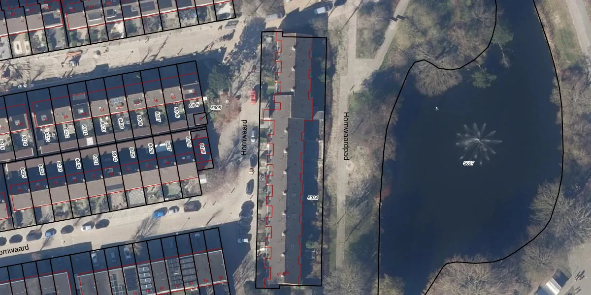 Het perceel waarop Hornwaard 96 staat heeft een oppervlakte van 1873 m². Dit is een zeer groot perceel. De perceeloppervlakte wordt geregistreerd door het Kadaster. Gedetailleerde informatie over de maten van dit perceel kunt u vinden in het rapport Kadastrale kaart met maatvoering van Hornwaard 96.