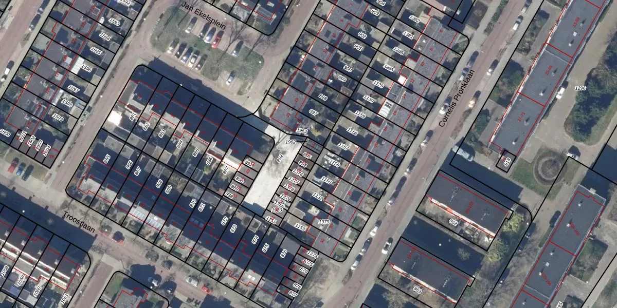 Het perceel waarop Jan Ekelsplein 25 staat heeft een oppervlakte van 19 m². Dit is een klein perceel. De perceeloppervlakte wordt geregistreerd door het Kadaster. Gedetailleerde informatie over de maten van dit perceel kunt u vinden in het rapport Kadastrale kaart met maatvoering van Jan Ekelsplein 25.