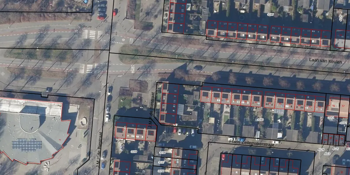 Het perceel waarop J.M.P.de Biestraat 1 staat heeft een oppervlakte van 2677 m². Dit is een zeer groot perceel. De perceeloppervlakte wordt geregistreerd door het Kadaster. Gedetailleerde informatie over de maten van dit perceel kunt u vinden in het rapport Kadastrale kaart met maatvoering van J.M.P.de Biestraat 1.