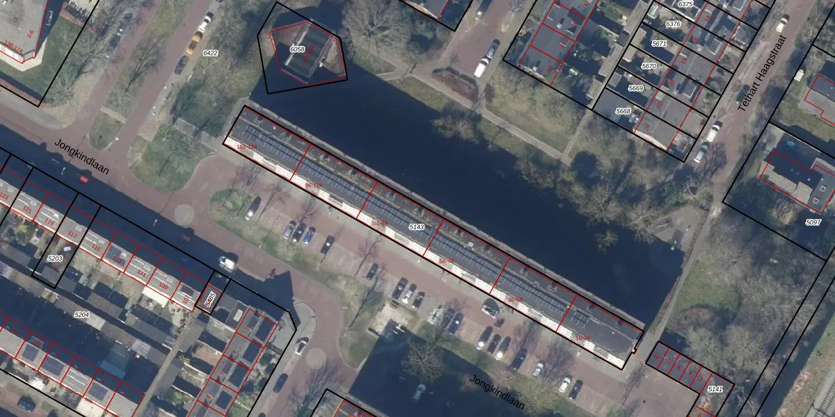 Het perceel waarop Jongkindlaan 90 staat heeft een oppervlakte van 1184 m². Dit is een zeer groot perceel. De perceeloppervlakte wordt geregistreerd door het Kadaster. Gedetailleerde informatie over de maten van dit perceel kunt u vinden in het rapport Kadastrale kaart met maatvoering van Jongkindlaan 90.