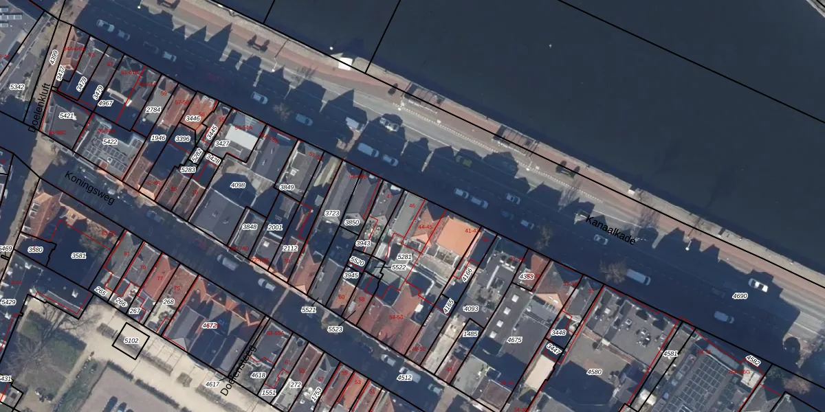 Het perceel waarop Kanaalkade 46 staat heeft een oppervlakte van 604 m². Dit is een groot perceel. De perceeloppervlakte wordt geregistreerd door het Kadaster. Gedetailleerde informatie over de maten van dit perceel kunt u vinden in het rapport Kadastrale kaart met maatvoering van Kanaalkade 46.