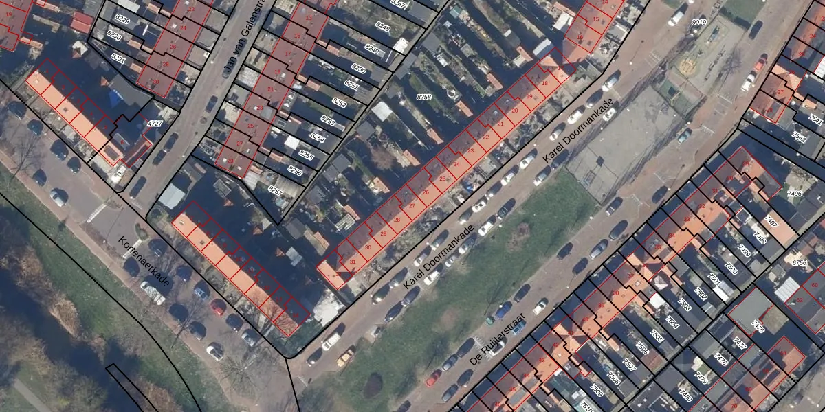 Het perceel waarop Karel Doormankade 27 staat heeft een oppervlakte van 4677 m². Dit is een zeer groot perceel. De perceeloppervlakte wordt geregistreerd door het Kadaster. Gedetailleerde informatie over de maten van dit perceel kunt u vinden in het rapport Kadastrale kaart met maatvoering van Karel Doormankade 27.